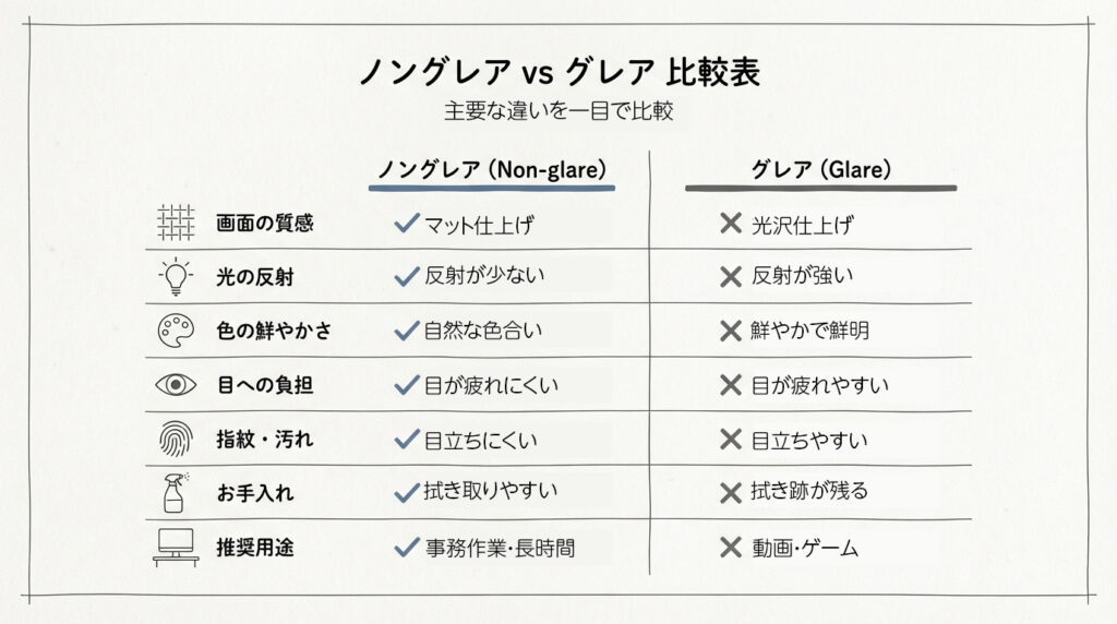ノングレアとグレアの違いをひと目で把握できるよう、主要な比較ポイントを表にまとめました。