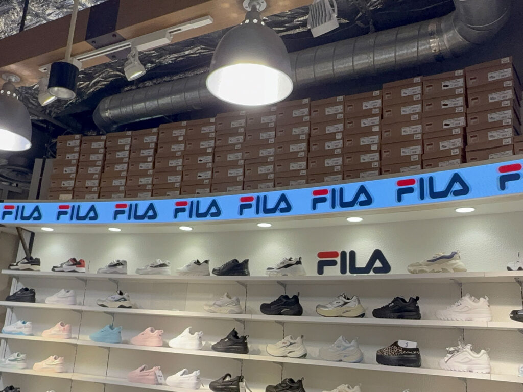 シューズウォール上部にアーチ状に設置されたティッカーが、FILAのブランドロゴを流れるように表示し、洗練された店舗空間を演出しています。