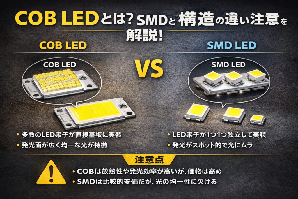 2026.01.30 COB LED LEDビジョン SMD COB LEDとは?SMDとの構造の違いと注意点を解説! 記事はこちら COB LEDとは?SMDとの構造の違いと注意点を解説! 前へ 一覧へ 次へ